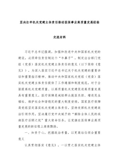 【七哥公文】2025年:坚决扛牢机关党建主体责任推动医保事业高质量发展经验交流材料+更多免费公文+VX:QiGeGongWen2024