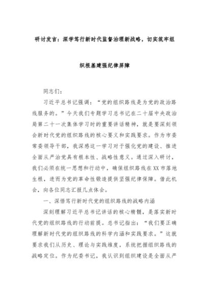 【七哥公文】2025年:研讨发言:深学笃行新时代监督治理新战略,切实筑牢组织根基建强纪律屏障+更多免费公文+VX:QiGeGongWen2024