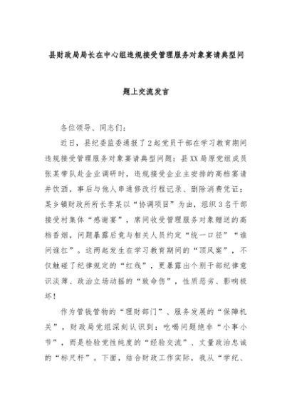 【七哥公文】2025年:县财政局局长在中心组违规接受管理服务对象宴请典型问题上交流发言+更多免费公文+VX:QiGeGongWen2024