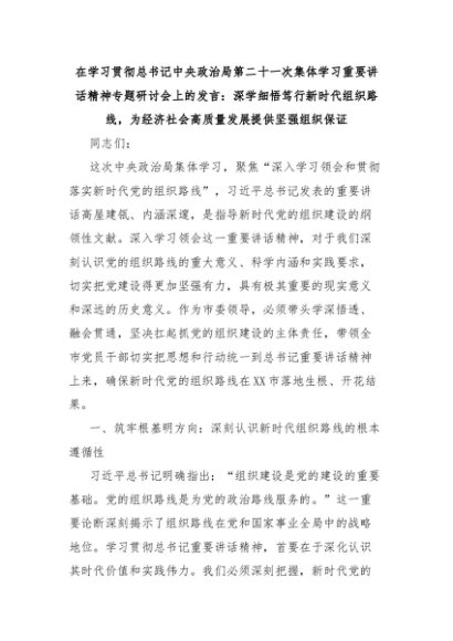 【七哥公文】2025年:在学习贯彻总书记中央政治局第二十一次集体学习重要讲话精神专题研讨会上的发言:深学细悟笃行新时代组织路线,为经济社会高质量发展提供坚强组织保证+更多免费公文+VX:QiGeGongWen2024