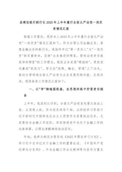 【七哥公文】2025年:县建设银行副行长2025年上半年履行全面从严治党一岗双责情况汇报+更多免费公文+VX:QiGeGongWen2024