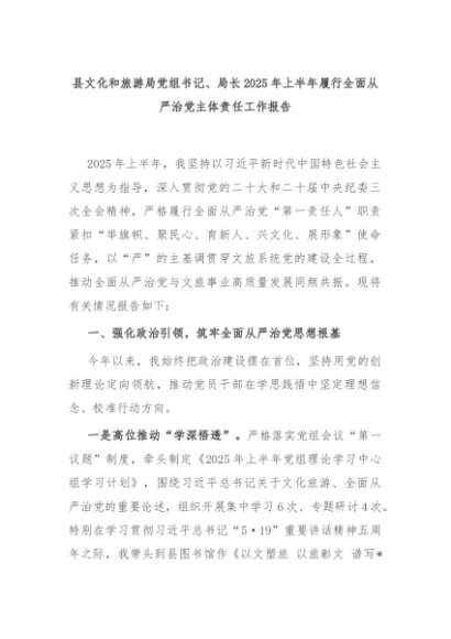 【七哥公文】2025年:县文化和旅游局党组书记、局长2025年上半年履行全面从严治党主体责任工作报告+更多免费公文+VX:QiGeGongWen2024