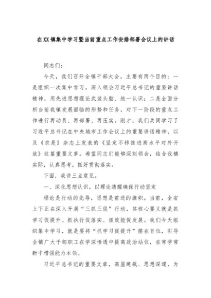 【七哥公文】2025年:在XX镇集中学习暨当前重点工作安排部署会议上的讲话+更多免费公文+VX:QiGeGongWen2024