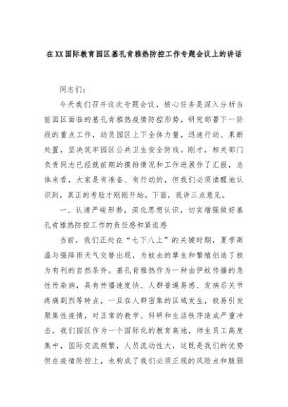 【七哥公文】2025年:在XX国际教育园区基孔肯雅热防控工作专题会议上的讲话+更多免费公文+VX:QiGeGongWen2024
