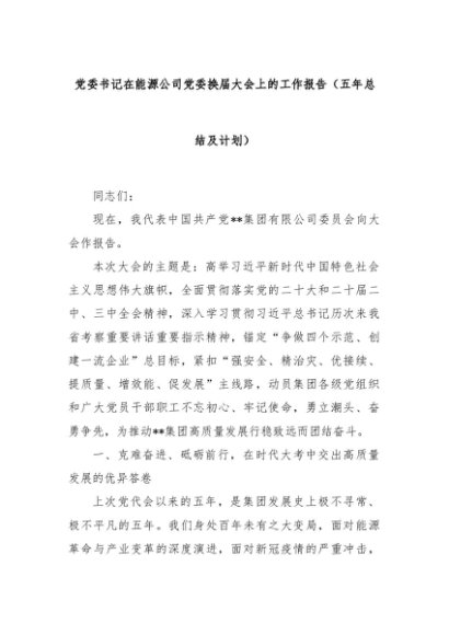 【七哥公文】2025年:党委书记在能源公司党委换届大会上的工作报告(五年总结及计划)+更多免费公文+VX:QiGeGongWen2024