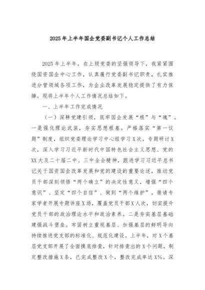 / 【七哥公文】2025年:2025年上半年国企党委副书记个人工作总结+更多免费公文+VX:QiGeGongWen2024