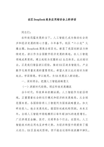【七哥公文】2025年:在区DeepSeek政务应用培训会上的讲话+更多免费公文+VX:QiGeGongWen2024