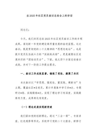 / 【七哥公文】2025年:在2025年社区党员春训总结会上的讲话+更多免费公文+VX:QiGeGongWen2024