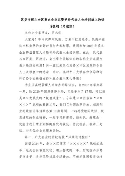 【七哥公文】2025年:区委书记在全区重点企业家暨党外代表人士培训班上的讲话提纲(总裁班)+更多免费公文+VX:QiGeGongWen2024