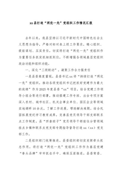 / 【七哥公文】2025年:xx县打造“两优一先”党组织工作情况汇报+更多免费公文+VX:QiGeGongWen2024