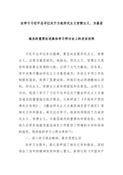 【七哥公文】2025年:在学习习近平总书记关于力戒形式主义官僚主义、为基层减负的重要论述集体学习研讨会上的发言材料+更多免费公文+VX:QiGeGongWen2024