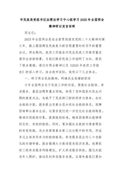 【七哥公文】2025年:市民政局党组书记在理论学习中心组学习2025年全国两会精神研讨发言材料+更多免费公文+VX:QiGeGongWen2024