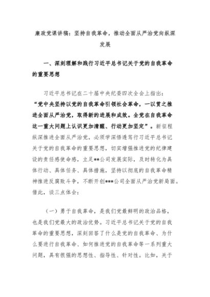 【七哥公文】2025年:廉政党课讲稿:坚持自我革命,推动全面从严治党向纵深发展+更多免费公文+VX:QiGeGongWen2024