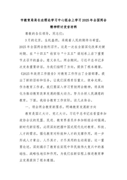 【七哥公文】2025年:市教育局局长在理论学习中心组会上学习2025年全国两会精神研讨发言材料+更多免费公文+VX:QiGeGongWen2024