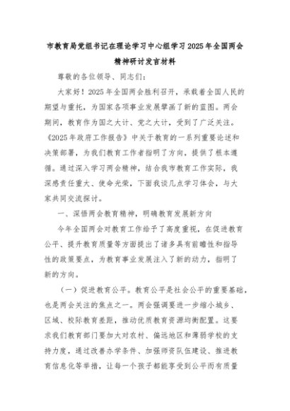 【七哥公文】2025年:市教育局党组书记在理论学习中心组学习2025年全国两会精神研讨发言材料+更多免费公文+VX:QiGeGongWen2024