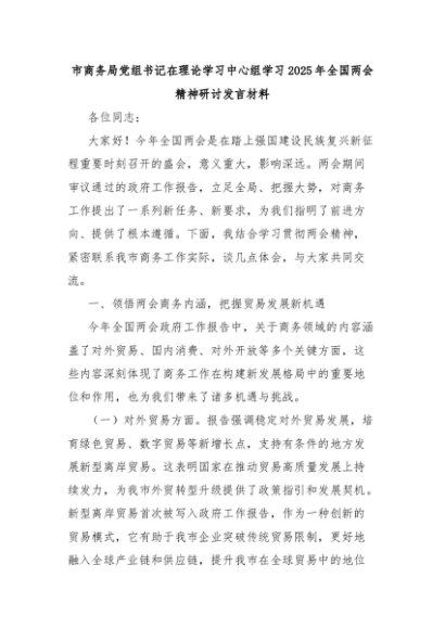 【七哥公文】2025年:市商务局党组书记在理论学习中心组学习2025年全国两会精神研讨发言材料+更多免费公文+VX:QiGeGongWen2024
