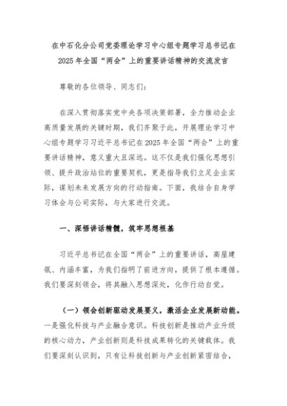 【七哥公文】2025年:在中石化分公司党委理论学习中心组专题学习总书记在2025年全国“两会”上的重要讲话精神的交流发言+更多免费公文+VX:QiGeGongWen2024