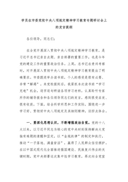 【七哥公文】2025年:学员在市委党校中央八项规定精神学习教育专题研讨会上的发言提纲+更多免费公文+VX:QiGeGongWen2024