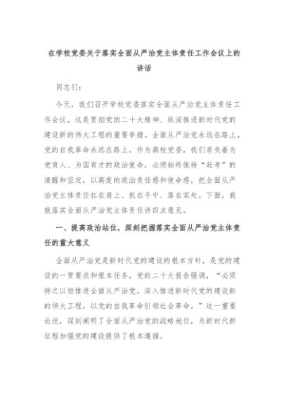 【七哥公文】2025年:在学校党委关于落实全面从严治党主体责任工作会议上的讲话+更多免费公文+VX:QiGeGongWen2024