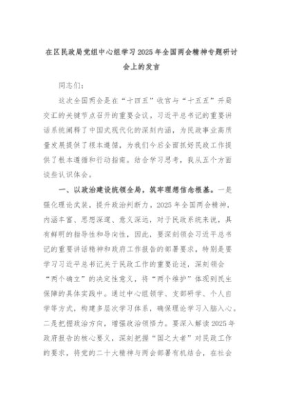 【七哥公文】2025年:在区民政局党组中心组学习2025年全国两会精神专题研讨会上的发言+更多免费公文+VX:QiGeGongWen2024