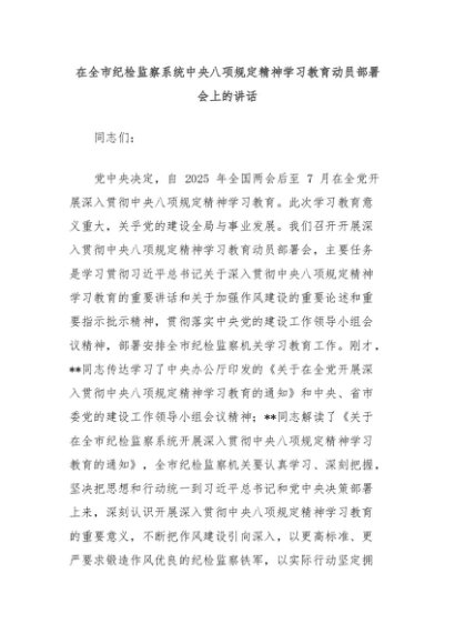 【七哥公文】2025年:在全市纪检监察系统中央八项规定精神学习教育动员部署会上的讲话+更多免费公文+VX:QiGeGongWen2024