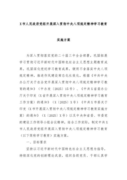 【七哥公文】2025年:X市人民政府党组开展深入贯彻中央八项规定精神学习教育实施方案+更多免费公文+VX:QiGeGongWen2024