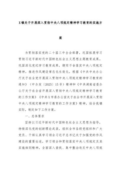 【七哥公文】2025年:X镇关于开展深入贯彻中央八项规定精神学习教育的实施方案+更多免费公文+VX:QiGeGongWen2024