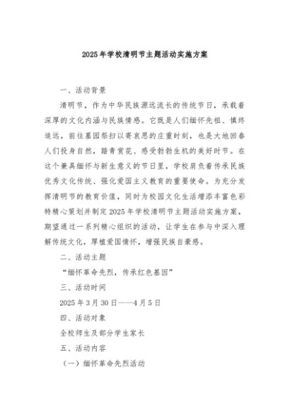 【七哥公文】2025年:2025年学校清明节主题活动实施方案+更多免费公文+VX:QiGeGongWen2024