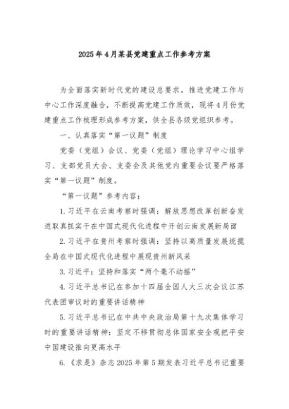 / 【七哥公文】2025年:2025年4月某县党建重点工作参考方案+更多免费公文+VX:QiGeGongWen2024