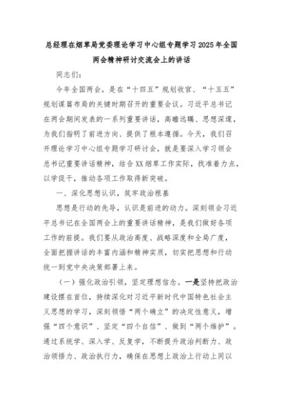 【七哥公文】2025年:总经理在烟草局党委理论学习中心组专题学习2025年全国两会精神研讨交流会上的讲话+更多免费公文+VX:QiGeGongWen2024