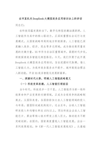 【七哥公文】2025年:在市直机关DeepSeek大模型政务应用培训会上的讲话+更多免费公文+VX:QiGeGongWen2024