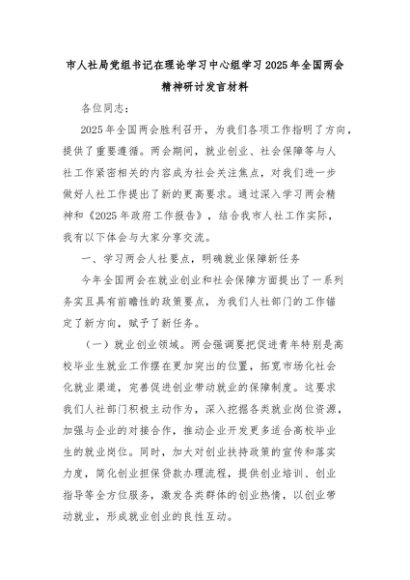【七哥公文】2025年:市人社局党组书记在理论学习中心组学习2025年全国两会精神研讨发言材料+更多免费公文+VX:QiGeGongWen2024