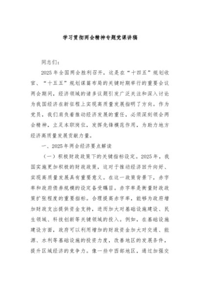 / 【七哥公文】2025年:学习贯彻两会精神专题党课讲稿+更多免费公文+VX:QiGeGongWen2024