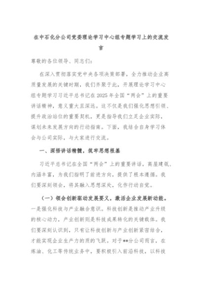 【七哥公文】2025年:在中石化分公司党委理论学习中心组专题学习上的交流发言+更多免费公文+VX:QiGeGongWen2024