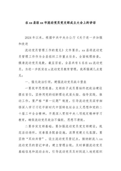 / 【七哥公文】2025年:在xx县驻xx市流动党员党支部成立大会上的讲话+更多免费公文+VX:QiGeGongWen2024