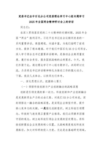 【七哥公文】2025年:党委书记在中石化分公司党委理论学习中心组专题学习2025年全国两会精神研讨会上的讲话+更多免费公文+VX:QiGeGongWen2024
