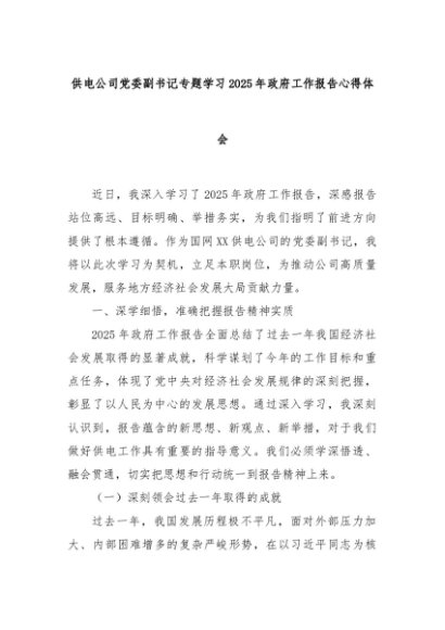 【七哥公文】2025年:供电公司党委副书记专题学习2025年政府工作报告心得体会+更多免费公文+VX:QiGeGongWen2024