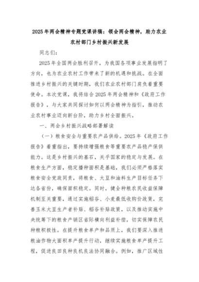【七哥公文】2025年:2025年两会精神专题党课讲稿:领会两会精神,助力农业农村部门乡村振兴新发展+更多免费公文+VX:QiGeGongWen2024