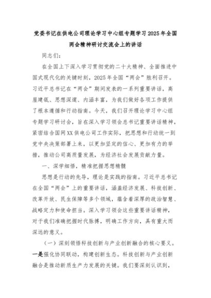 【七哥公文】2025年:党委书记在供电公司理论学习中心组专题学习2025年全国两会精神研讨交流会上的讲话+更多免费公文+VX:QiGeGongWen2024