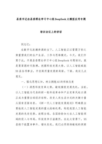 【七哥公文】2025年:县委书记在县委理论学习中心组DeepSeek大模型应用专题培训会议上的讲话+更多免费公文+VX:QiGeGongWen2024
