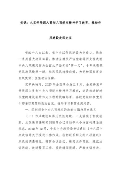 【七哥公文】2025年:党课:扎实开展深入贯彻八项规定精神学习教育,推动作风建设走深走实+更多免费公文+VX:QiGeGongWen2024