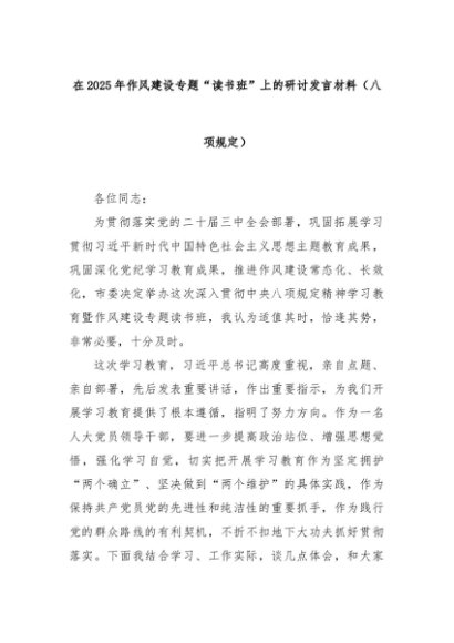 【七哥公文】2025年:在2025年作风建设专题“读书班”上的研讨发言材料(八项规定)+更多免费公文+VX:QiGeGongWen2024