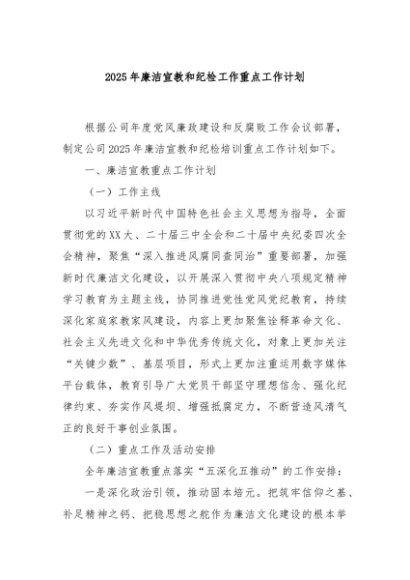 / 【七哥公文】2025年:2025年廉洁宣教和纪检工作重点工作计划+更多免费公文+VX:QiGeGongWen2024