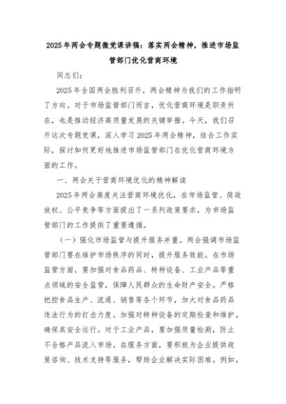 【七哥公文】2025年:2025年两会专题微党课讲稿:落实两会精神,推进市场监管部门优化营商环境+更多免费公文+VX:QiGeGongWen2024
