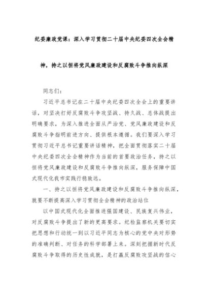 【七哥公文】2025年:纪委廉政党课:深入学习贯彻二十届中央纪委四次全会精神,持之以恒将党风廉政建设和反腐败斗争推向纵深+更多免费公文+VX:QiGeGongWen2024