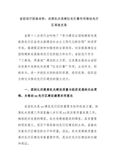 【七哥公文】2025年:省经信厅经验材料:发挥机关党建红色引擎作用推动先行区高速发展+更多免费公文+VX:QiGeGongWen2024