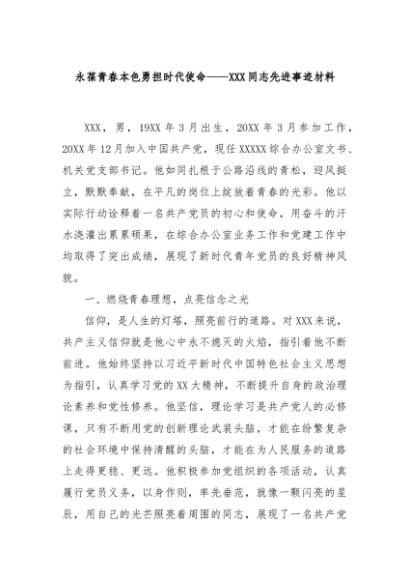 【七哥公文】2025年:永葆青春本色勇担时代使命——XXX同志先进事迹材料+更多免费公文+VX:QiGeGongWen2024