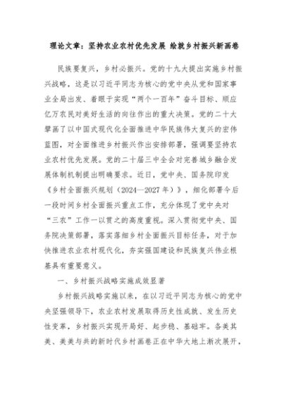 【七哥公文】2025年:理论文章:坚持农业农村优先发展 绘就乡村振兴新画卷+更多免费公文+VX:QiGeGongWen2024