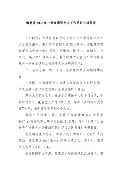 / 【七哥公文】2025年:镇党委2025年一季度意识形态工作研判分析报告+更多免费公文+VX:QiGeGongWen2024