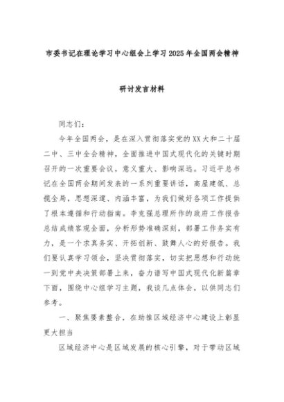 【七哥公文】2025年:市委书记在理论学习中心组会上学习2025年全国两会精神研讨发言材料+更多免费公文+VX:QiGeGongWen2024